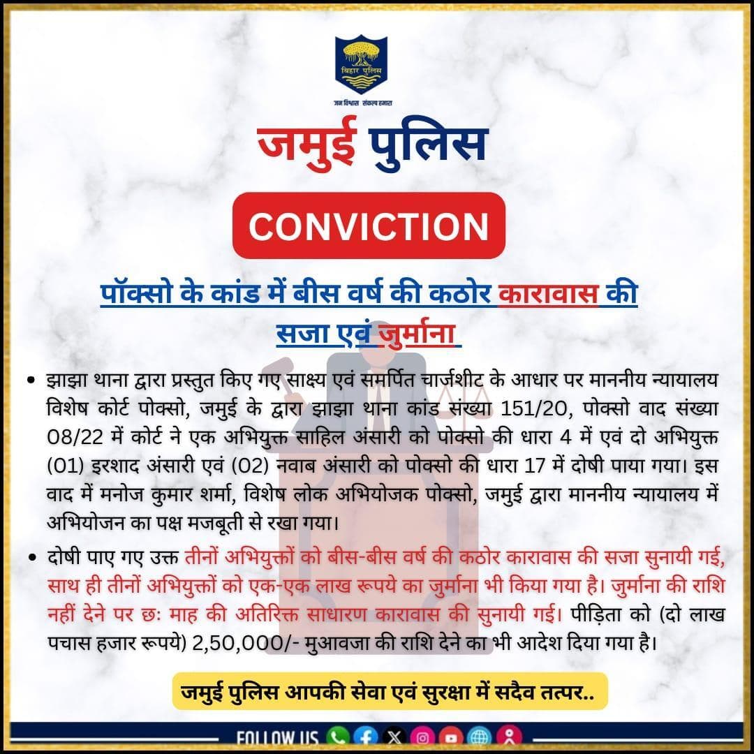 पॉक्सो के कांड में बीस वर्ष की कठोर कारावास की सजा एवं जुर्माना.. - Jamui News