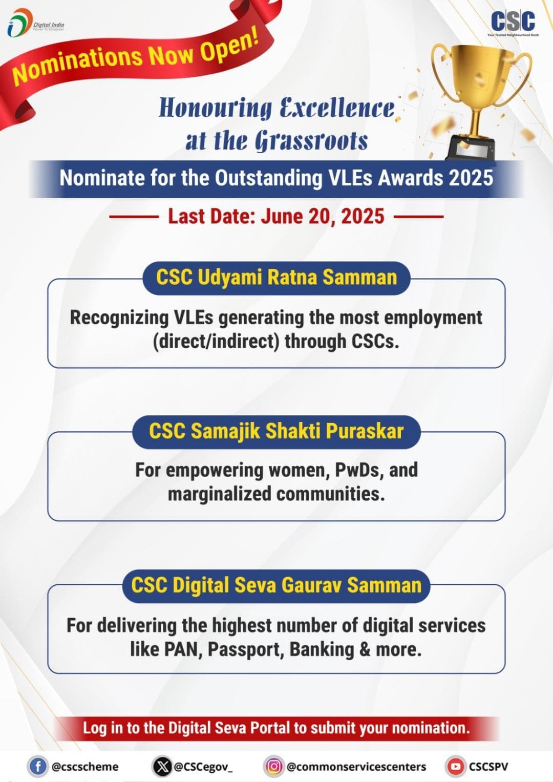 नामांकन खुले हैं! अंतिम तिथि: 20 जून 2025 CSC उद्यमी रत्न सम्मान – रोजगार सृजन में अग्रणी VLEs के लिए