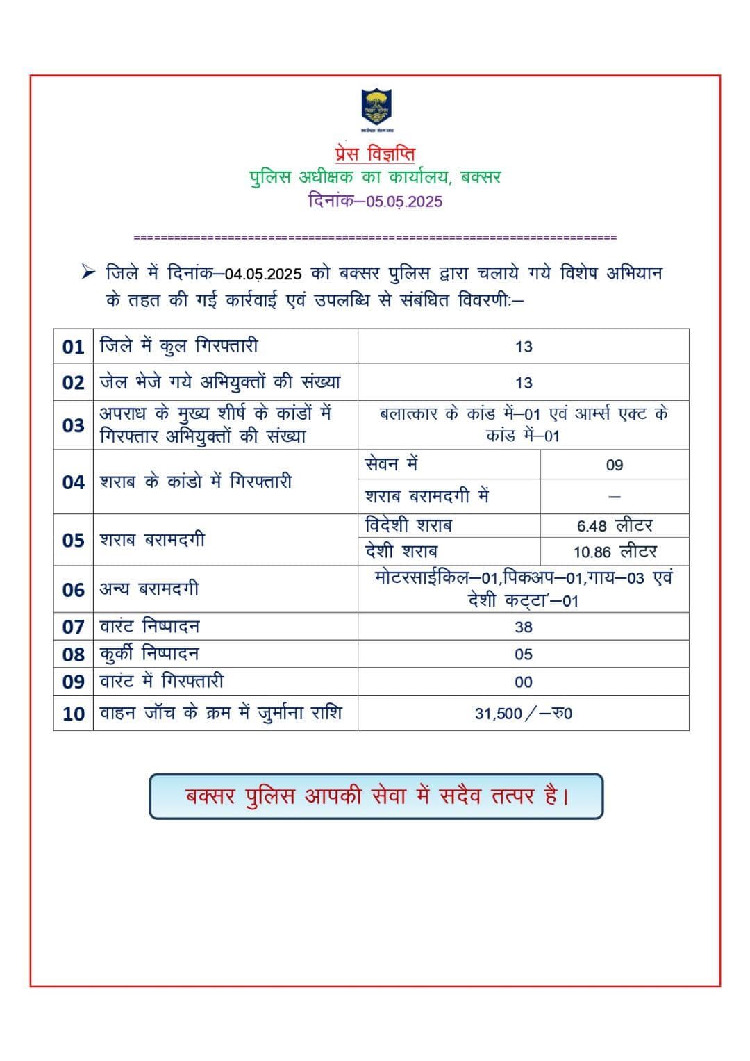 दिनांक 04-05-2025 को बक्सर जिलान्तर्गत की गई कार्रवाई एवं उपलब्धि से संबंधित विवरणी.....
