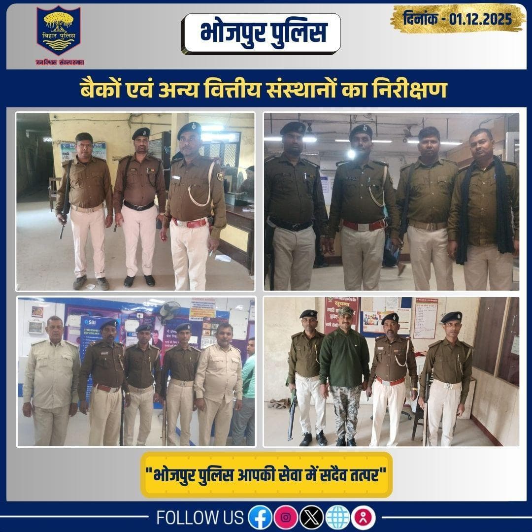 भोजपुर पुलिस द्वारा अपराध नियंत्रण और सुरक्षा व्यवस्था के लिए विभिन्न बैंकों और संस्थानों का औचक निरीक्षण किया गया।