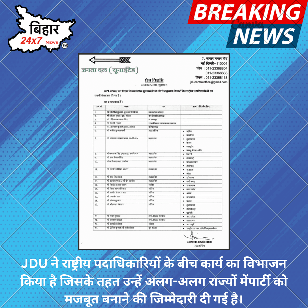 JDU ने राष्ट्रीय पदाधिकारियों के बीच कार्य का विभाजन किया है जिसके तहत उन्हें अलग-अलग राज्यों में पार्टी को मजबूत बनाने की जिम्मेदारी दी गई है।