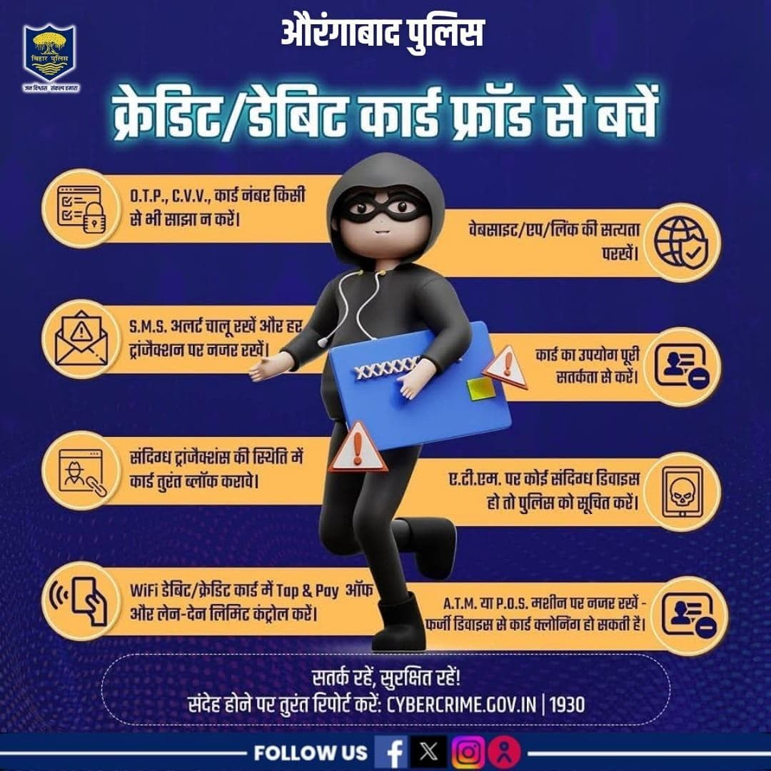 क्रेडिट/डेबिट कार्ड की गोपनीय जानकारी साझा करना फ्रॉड को न्योता देना है। O.T.P., P.I.N. या C.V.V. किसी से साझा न करें। - Aurangabad News