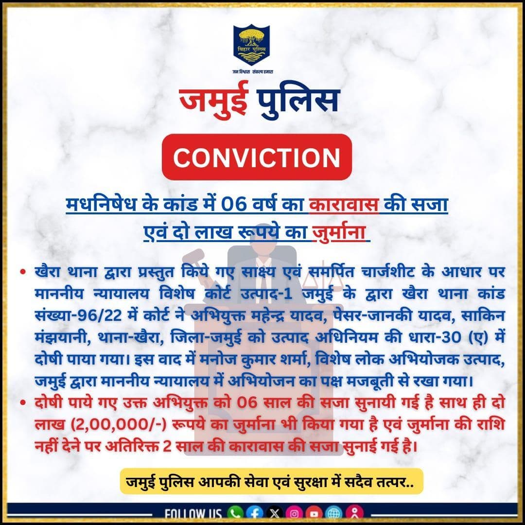 मधनिषेध के कांड में 06 वर्ष का कारावास की सजा एवं दो लाख रूपये का जुर्माना - Jamui News
