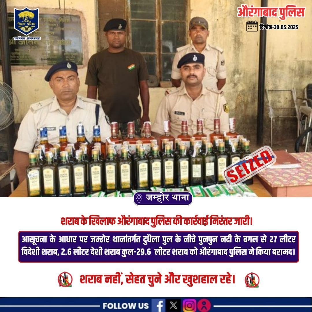 जम्होर थानांतर्गत से 27 लीटर विदेशी शराब, 2.6 लीटर देशी शराब कुल-29.6 लीटर शराब को औरंगाबाद पुलिस ने किया बरामद।