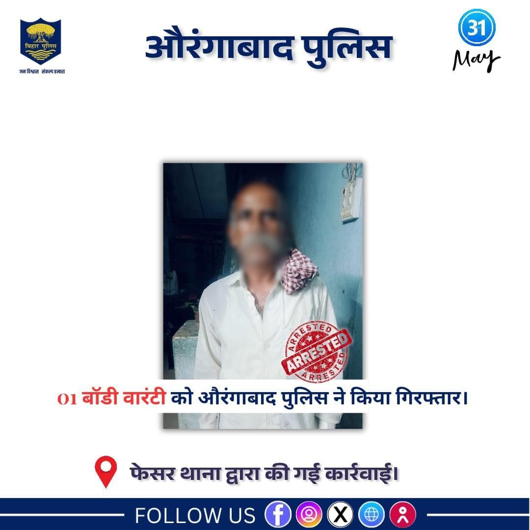 औरंगाबाद पुलिस ने 01 बॉडी वारंटी को ग्राम मोईउद्दीनपुर से किया गिरफ्तार फेसर थाना द्वारा की गई कार्रवाई।