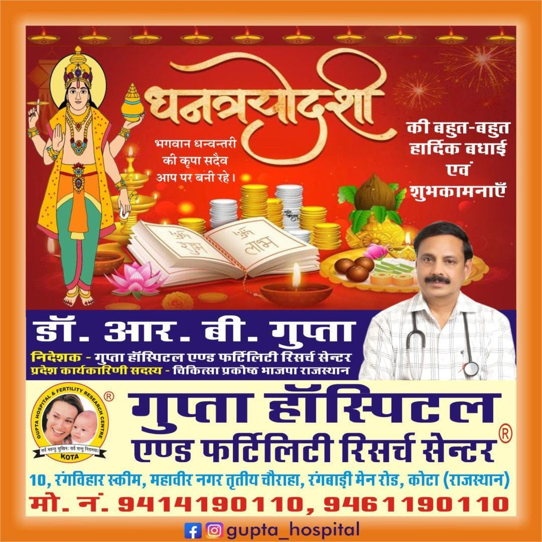 गुप्ता हॉस्पिटल की और से सभी क्षेत्रवासियों को धनतेरस की हार्दिक शुभकामनाएं - डॉक्टर आर बी गुप्ता मोबाइल नंबर 9414190110 - Ladpura News