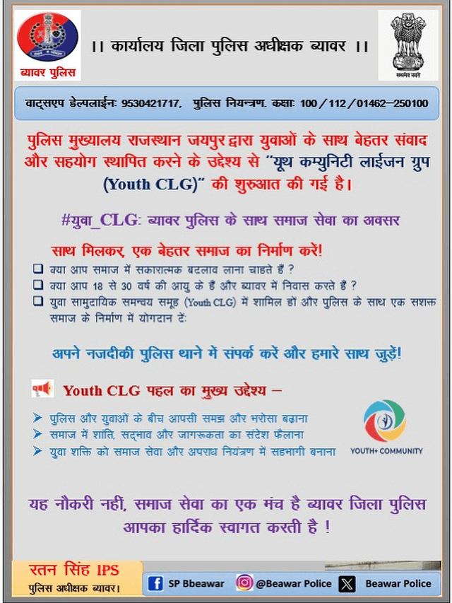 #ब्यावर_पुलिस की युवाओं के साथ बेहतर संवाद और सहयोग स्थापित करने के उद्देश्य से "यूथ कम्युनिटी लाईज़न ग्रुप (Youth CLG)" की शुरुआत की गई है। - Ajmer News
