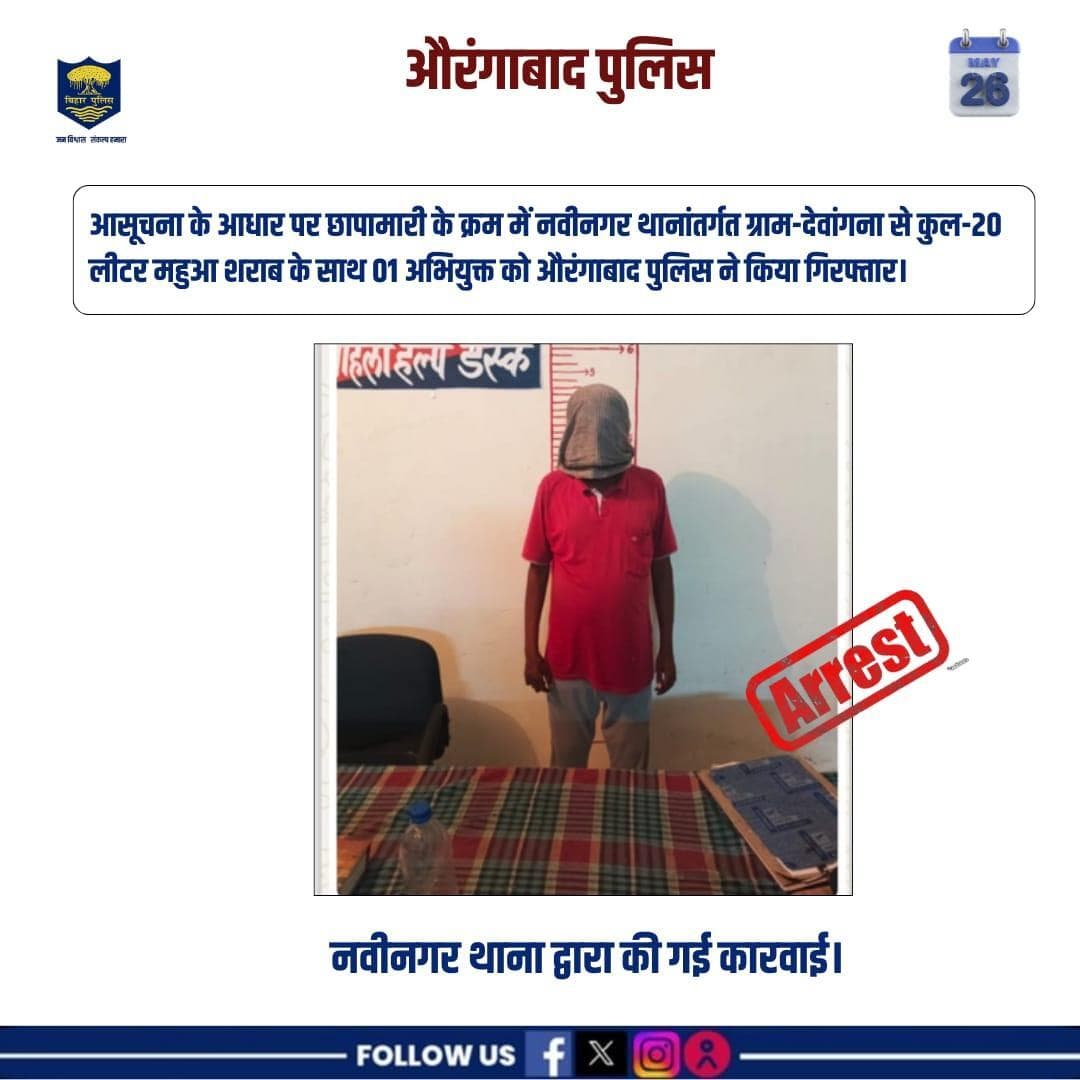 नवीनगर थानांतर्गत से कुल-20 लीटर महुआ शराब के साथ 01 अभियुक्त को औरंगाबाद पुलिस ने किया गिरफ्तार।