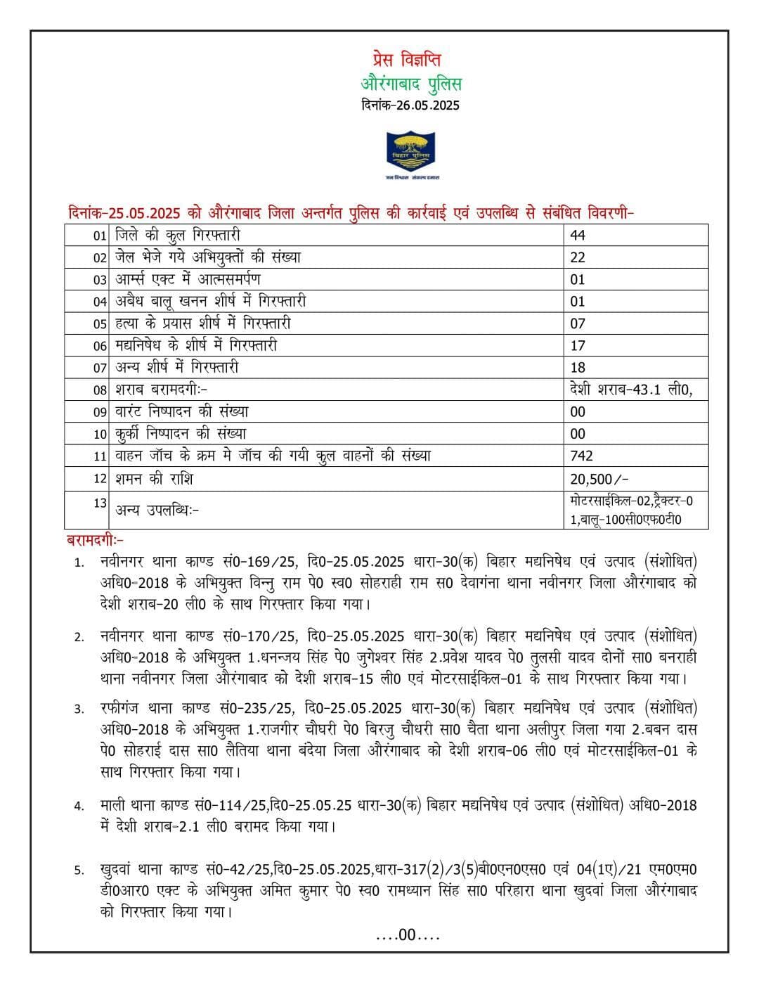 दिनांक-25.05.2025 को औरंगाबाद जिला अन्तर्गत पुलिस की कार्रवाई एवं उपलब्धि से संबंधित विवरणी-